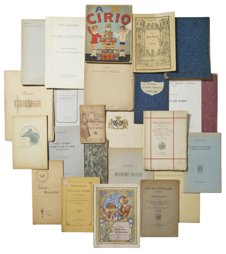 [Gastronomia - Menù]. Interessante lotto che contiene numerosi opuscoli e menù pubblicati in occasione di pernozze: esemplare no. 39/75 de Il "Moretum" e la "Copa" di Virgilio, pubblicato per le faustissime nozze Dott. Aldo Borletti - Luisa Tosi il 18 giugno 1936, LVII ricette d'un libro di cucina, pubblicato a Bologna nel 1890, per le nozze Luisa Franchetti con Vittorio Enriques, Pernozze Sajni-Fumagalli del 1892, volume stampato in soli 50 esemplari, e A Maria Callori dei conti di Vignale per le sue nozze col conte Giorgio de Viry del 1884 che contiene il "splendido convito nuziale dato da Gealeazzo Visconti, per citarne soltanto alcuni.