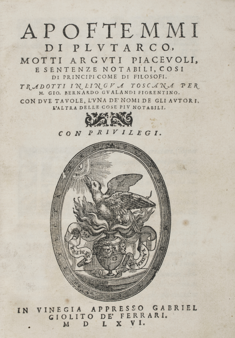 [Giolito de Ferrari]. Gruppo di volumi usciti dai torchi di Giolito de Ferrari: citiamo tra gli altri Apoftemmi di Plutarco, motti arguti piacevoli del 1566, Historia di Heliodoro delle cose ethiopiche, nella quale fra diversi, e compassionevoli avenimenti di due amanti, si contengono abbattimenti, descrittioni di paesi, e molte altre cose utili e dilettevoli a leggere del 1588 in legatura coeva in pergamena con tracce di due bindelle e titolo manoscritto al taglio inferiore, il Dialogo dell'honore di M. Giovanni Battista Possevini mantovano nel quale si tratta a pieno del duello del 1559 entro legatura coeva in pergamena con titolo manoscritto al taglio inferiore, e Le attioni morali dell'illust. sig. conte Giulio Landi del 1564 entro legatura coeva in pergamena con unghiatura e tracce di due bindelle.