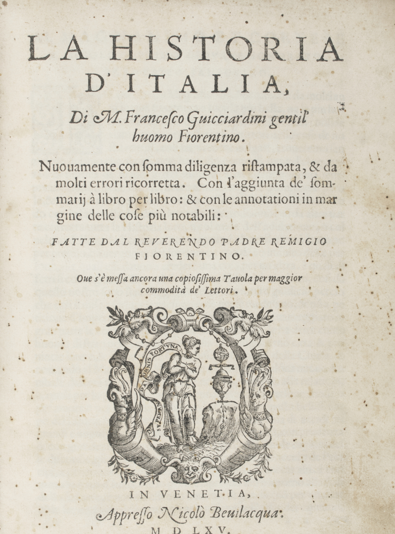 Guicciardini, Francesco. La Historia d'Italia. Venezia, Niccolò Bevilacqua, 1565.