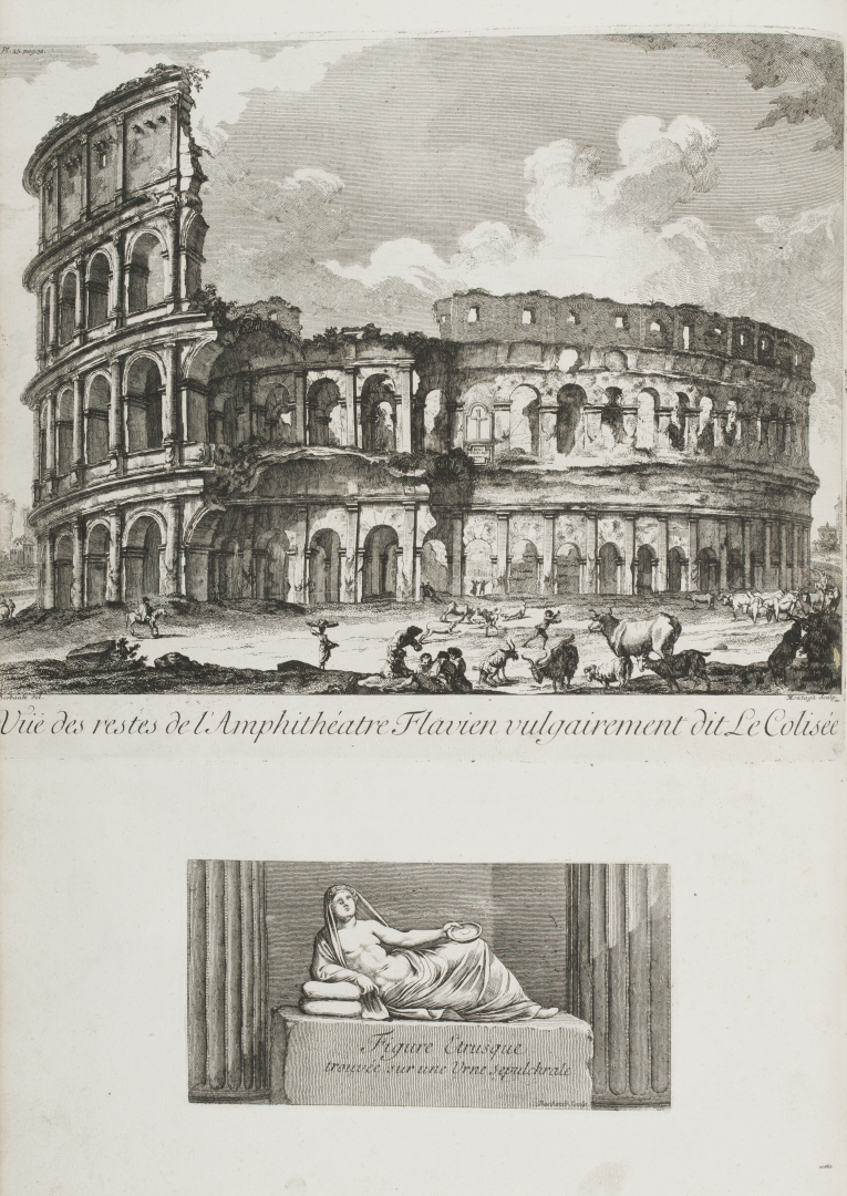 Prima edizione di questa magnifica opera, lussuosamente illustrata da un collaboratore di Piranesi, che restituisce l'atmosfera di Roma, così come la scoprivano i visitatori curiosi all'epoca del Grand Tour: maestose rovine ricoperte di muschio e vegetazione, in un equilibrio quasi instabile, greggi e pastori che si appropriano dei resti di un passato splendore. Il tutto evoca la fuga del tempo con una nostalgia già preromantica.