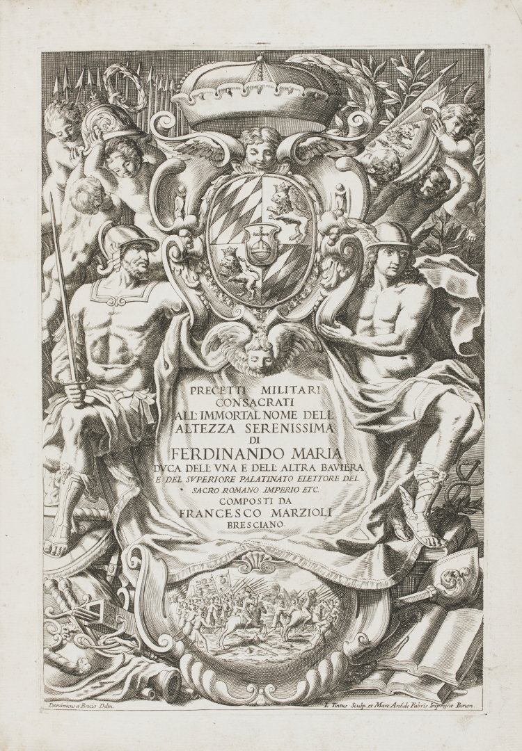 Marzioli, Francesco. Precetti militari consacrati all'immortal nome dell'altezza serenissima di Ferdinando Maria duca dell'una ed dell'altra Baviera. Bologna, eredi di Domenico Barbieri, 1670.