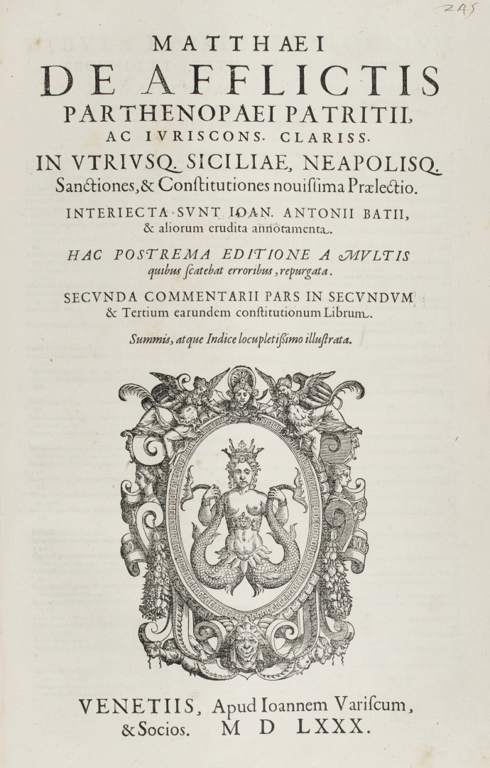 [Sicilia - Giuridica]. Prima edizione uscita dai torchi del veneziano Giovanni Varisco dell'opera In utriusq. Siciliae, Neapolisq. Sanctiones, & Constitutiones novissima Praelectio del 1580 a cura di Matteo D'Afflitto con 2 tomi in 1 volume, entro legatura coeva in pergamena con titolo in oro su tassello al dorso liscio e tagli marmorizzati. Il volume contiene le lezioni accademiche intorno alla Costituzioni del Regno delle Due Sicilie risalenti, secondo la tradizione, a Federico II. la prima edizione risale al 1517, ma il testo divenne presto un classico della letteratura giuridica cinquecentesca.