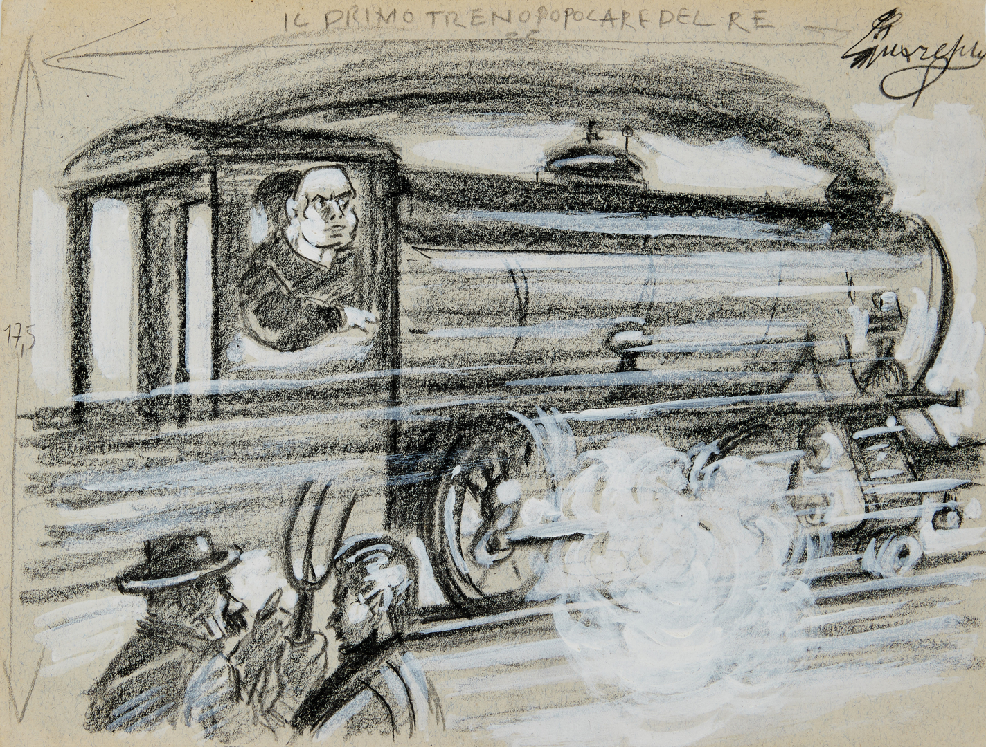 Guareschi, Giovannino. Il primo treno popolare del Re. Bozzetto firmato (240 x 315 mm), realizzato verosimilmente negli anni Quaranta, in preparazione di una vignetta satirica per il Candido, settimanale fondato da Guareschi insieme a Giovanni Mosca nel 1945. Alla guida di una sfrecciante locomotiva a vapore si vede una figura caricaturale e simile al Duce, il "macchinista" che condusse i Savoia verso la Seconda guerra mondiale e l'esilio dall'Italia.