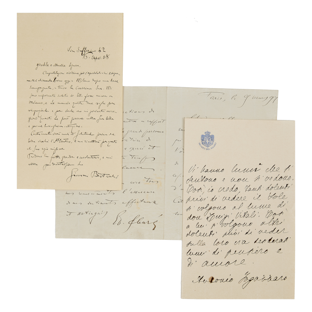[Letteratura]. Bell'insieme di lettere autografe di letterati e intellettuali vissuti tra fine Ottocento e inizio Novecento, tra cui spicca una lettera autografa di Antonio Fogazzaro, 1 pagina in 8° su carta intestata del Senato del Regno. L'autore di Piccolo mondo antico rivolge con slancio poetico una sentita dedica a Monsignor Luigi Vitali, direttore dell'Istituto dei Ciechi di Milano: "Vi hanno lumi che si sentono e non si vedono. Così, io credo, tanti dolenti privi di vedere il Sole si volgono al lume di don Luigi Vitali. Così a lui si volgono altri dolenti privi di veder sulla loro via desiderati lumi di pensiero e d'amore". Il lotto comprende, inoltre, una lettera autografa di Édouard Fleury, datata "Paris, le 7 mars (18)77", e indirizzata a una "Mademoiselle", a cui lo storico, giornalista e illustratore francese ricorda come l'opera di Richard Wagner "a exercé et exerce encore sur notre temps une si profonde influence". Sono incluse, infine, una lettera autografa del librettista Arturo Colautti e una del poeta e critico letterario Giovanni Bertacchi.