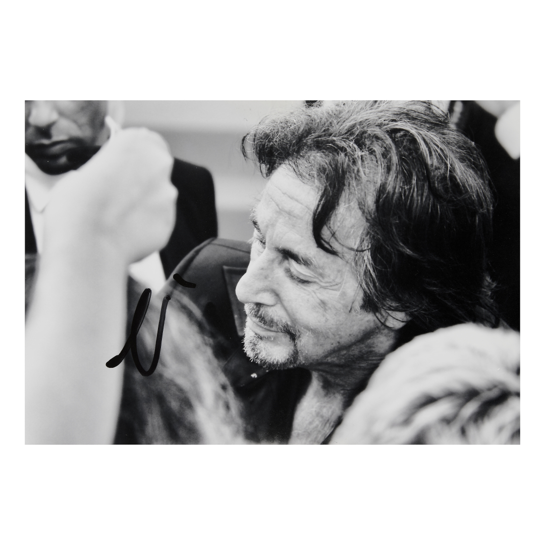 Al Pacino. Autografo su bel ritratto fotografico di tre quarti, in bianco e nero (125 x 180 mm). La foto venne scattata da un fotografo professionista sul red carpet del Festival del Cinema di Venezia, in occasione di una delle partecipazioni dell'attore all'evento. Al Pacino, vincitore del premio Oscar nel 1993, ha interpretato personaggi memorabili in numerosi gangster movie di enorme successo, tra cui Il Padrino, Scarface, Carlito's Way e The Irishman, ma si è distinto anche come attore teatrale, in particolare in intensi ruoli shakespeariani.