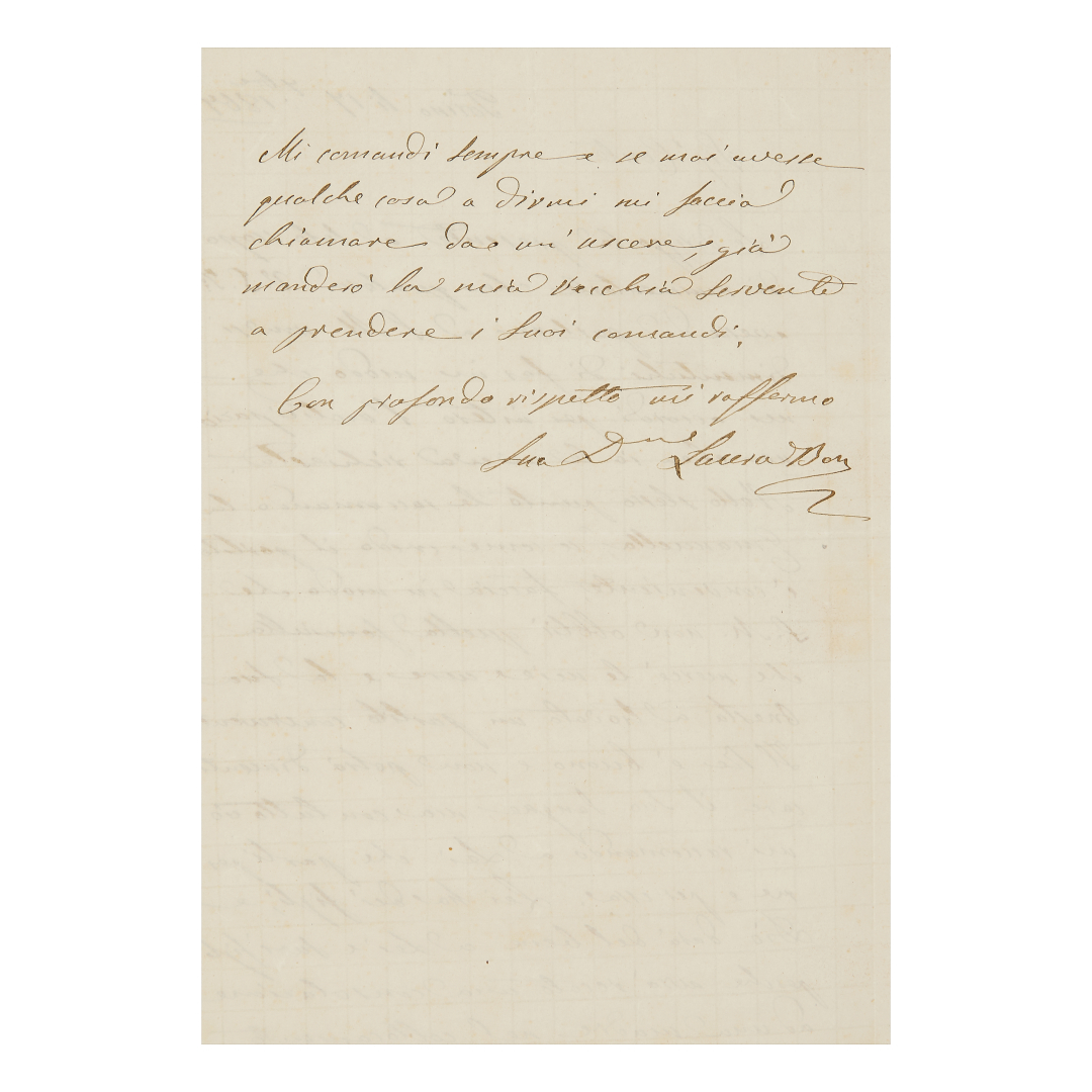 Bon, Laura. Lettera autografa firmata dell’attrice teatrale, nota per essere stata favorita di Vittorio Emanuele II, da “Torino, li 17 7bre 1864” diretta a un “Sig. Conte” e riguardante la figlia Emanuela avuta dal sovrano, registrata come figlia del conte Vittorio di Roverbella. “Nello stesso punto le raccomando la Emanuella, se come credo il partito è conveniente, faccia in modo che S. M. non obblii quella fanciulla… Il Re è buono e non potrà dimenticare il suo sangue, ma non tutto ciò mi raccomando a Lei che parli per me e per essa”. Due pagine in 8°.