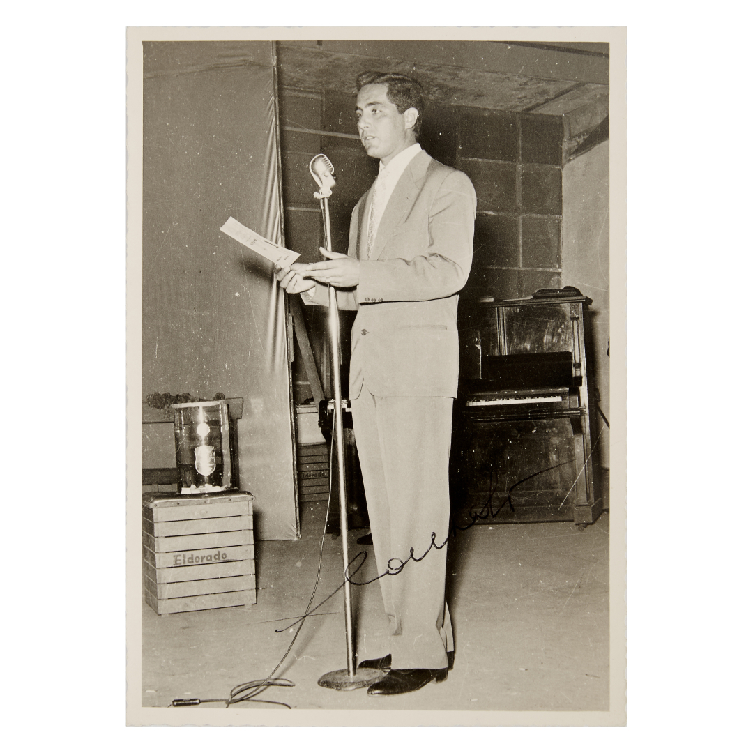 Mantoni, Corrado. Firma autografa del presentatore e conduttore televisivo su fotografia (140 x 100 mm) che lo ritrae in giovane età davanti a un microfono.