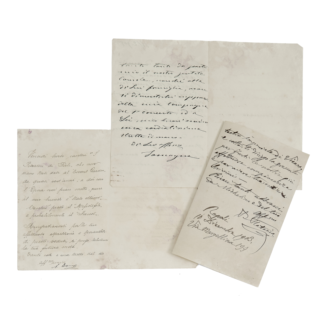[Musica]. Piccolo corpus di quattro lettere autografe firmate, in parte inerenti a interessanti questioni professionali e indirizzate al maestro Francesco Spetrino da alcuni protagonisti della vita musicale tra gli ultimi anni dell’Ottocento e i primi del Novecento: il compositore Pietro Platania e i cantanti Mattia Battistini, Francesco Tamagno (con busta postale affrancata) e Alessandro Bonci (dal Savoy Hotel di Londra, 24 giugno 1908: “Caro Amico, ho inteso con vivissima soddisfazione… che sei stato scritturato al Metropolitan. Venerdì scorso cantai “I Pescatori di Perle” che non erano stati dati al “Covent Garden” da quasi vent’anni… Canterò presto il “Mefistofele” e probabilmente il “Faust”).