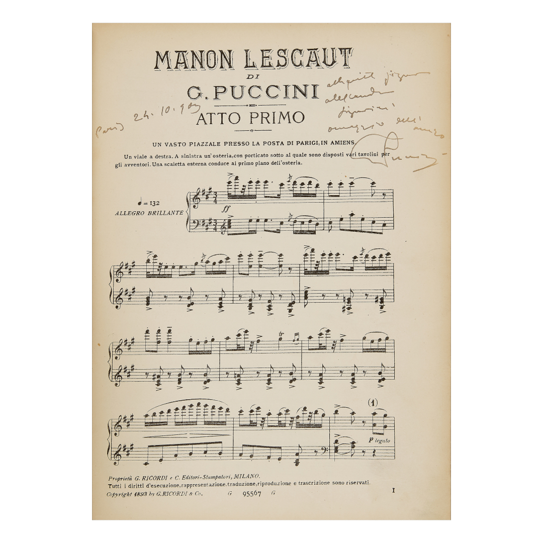 Puccini, Giacomo. Dedica autografa firmata sulla prima pagina dello spartito per canto e pianoforte di Manon Lescaut datata “Paris 24.10.903” a una “signorina, omaggio dell’amico G. Puccini”.