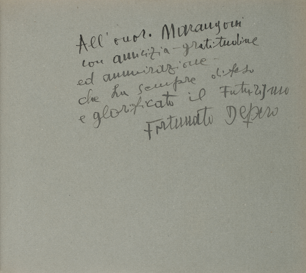 Freschissima copia di presentazione con dedica di Depero a Guido Marangoni (1872-1941), deputato dal 1909 al 1921, conservatore del Castello Sforzesco, giornalista, fondatore e direttore de “La Casa bella” e, soprattutto, ideatore, propugnatore, animatore e Direttore Generale delle Mostre Internazionali di Arti Decorative, poi note come Biennale di Monza. Le prime tre edizioni, dal 1923 al 1927, si svolgono ogni due anni a Monza, nella Villa Reale, e costituiscono la premessa delle future Triennali, che dal 1933 avrebbero trasferito la propria sede a Milano, nel Palazzo dell’Arte.