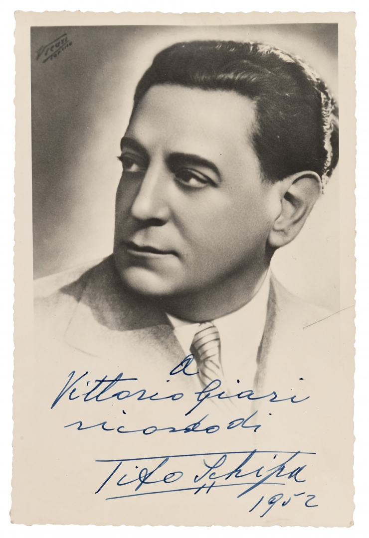 Schipa, Tito. Fotografia con dedica "A Vittorio Giani" e firma autografa del celebre tenore, datata 1952 (180 x 120 mm).