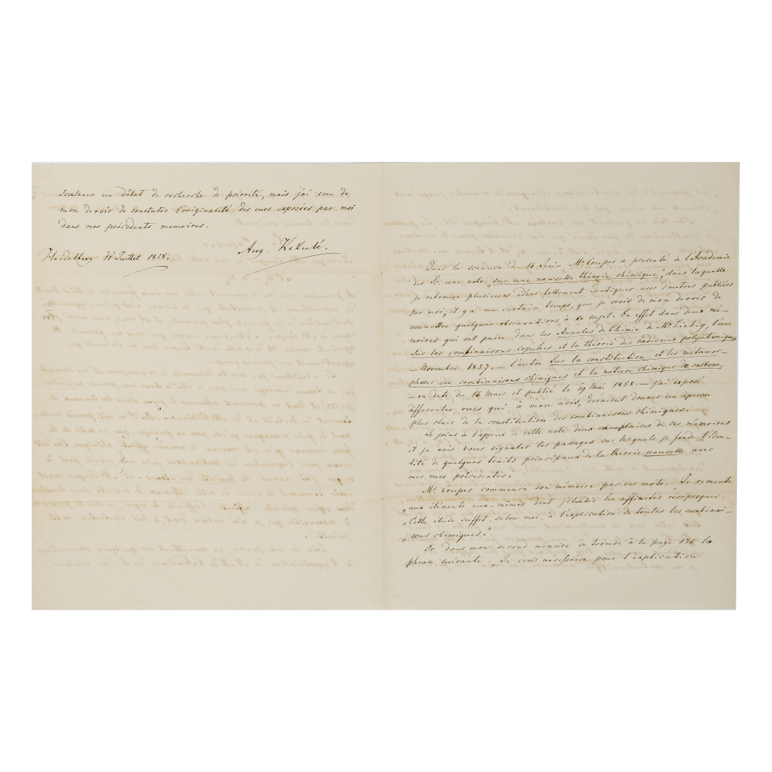 Kekulé von Stradonitz, Friedrich August. Bella ed estesa lettera autografa in francese firmata “Aug. Kekulé” da “Heidelberg 11 Juillet 1858” in cui il celebre chimico tedesco si riconduce a una recente presentazione (14 giugno) “a l’Académie” di una nuova teoria chimica da parte di Mr. Couper [il chimico scozzese Archibald] per esporre una serie di proprie considerazioni facendo uso anche di alcune formule. “Je joins à… cette note deux exemplaires de ces mémoires et je vais vous signaler les passages sur lesquels je fonde l’identité de quelques traits principaux de la theorie nouvelle avec mes vues précedentes… Je n’insisterai pas sur la découverte de ce groupement des éléments, qui se trouve dévelopé avec plus de détails dans ma premier memoire (p. 133) et dont on pourrait retrouver le germe dans les travaux de Laurent, de Gerhardt et de M. Williamson. Qu’il me soit permis seulement de faire remarquer qu’elle pose en principe, que, en outre de la force inconnue qu’on est convenu de nommer affinité chimique, l’on doit encore pour l’explication des combinaisons, faire una grande part à ce que j’ai nommé la basicité des atomes”. Splendido documento. Quattro pagine in 4°.