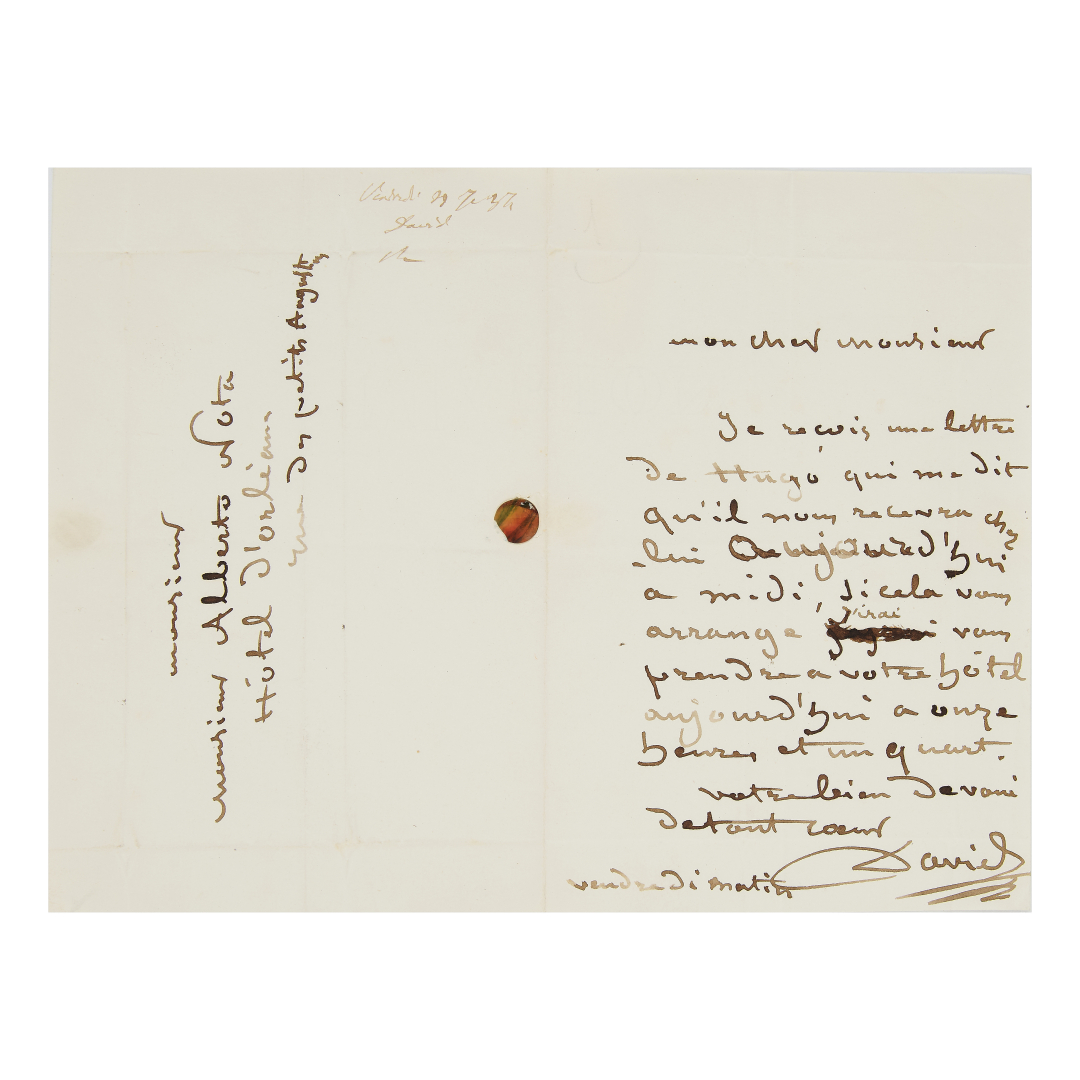 David, Jacques-Louis. Breve biglietto autografo firmato “David” dall’artista francese indirizzata a un “Mon cher Monsieur” relativo a una lettera da ritirare presso il domicilio del destinatario. Una pagina in 16°.