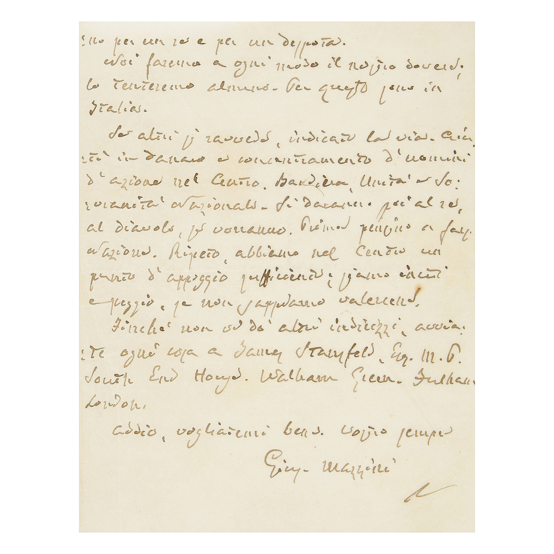 Mazzini, Giuseppe. 2 lettere autografe firmate. La prima, con firma "Gius. Mazzini" e data "2.Agosto.54", 3 pagine in 16°, aiuta a ricostruire l'attività del grande patriota che, lasciata Londra, si trova in Italia nel tentativo di organizzare moti nel centro della penisola e contiene attacchi alla monarchia e riflessioni amare sull'inerzia politica degli italiani: "Fratello, eccovi le due ricevute. Sono in questa carta, perché non sono in Londra, ma dove importa. Avevamo ragione, come sempre. A che pro? [...] gli Italiani hanno coraggio, capacità di sacrificio ogni cosa fuorch'una, coscienza di sè, dignità. Giurarono tutti che il '48 era l'ultima delusione. [...] Sono incorreggibili. Se avessero coscienza di sé e dignità d'uomini, sentirebbero che non v'è se non uno slancio gigantesco d'attività e di volontà [...] che possa salvarci dalla vergogna di aver rivendicato a liberarci l'aiuto d'un despota. [...] Danari, uomini, tutto, dovrebbero affluire al Centro". Mazzini conclude che gli italiani "non troveranno l'energia di fare per un popolo, pel loro popolo, ciò che facevano per un re o per un despota. Noi faremo a ogni modo il nostro dovere; lo tenteremo almeno. Per questo sono in Italia. [...] Bandiera, Unità e Sovranità nazionale si daranno poi al re, al diavolo, se vorranno. [...] Prima pensino a farci un'azione. Ripeto, abbiamo nel Centro un punto d'appoggio sufficiente. [...] Finché non vi do altri indirizzi, avviate ogni cosa a James Stansfeld [...] Addio, vogliatemi bene, vostro sempre". Ottimo stato di conservazione. Anche nella seconda, firmata "Gius. M" e datata "12 luglio", 2 pagine in 16°, il destinatario è indicato soltanto come "Fratello". Mazzini, indebolito da un dolore "alla spina dorsale", si esprime in modo sintetico - "ho appena il tempo di scrivervi due parole" - e circospetto: "Ebbi la vostra. [...] il proposto da voi è in parte fatto". Tuttavia, ancora si "indugia per mancanza di aiuti finanziari, poiché sono difficili a trovarsi. Attendete alcuni giorni. Se in questi otterrò convincimento che possiamo fare, v'avvertirò". La realizzazione del piano "pende dal trovarsi i pochi mezzi de' quali accennavi". L'epistola si chiude con un riferimento al periodico Pensiero ed Azione e con un invito al "Fratello" a procedere con estrema cautela: "Ho veduto il primo numero del Pensiero [...] siate più che cauto: taccio, per posta, del disegno con tutti gli altri amici". Piccoli strappi ai margini, tracce di sigillo in ceralacca. Documenti venduti all'asta da Sotheby's nel 1990.