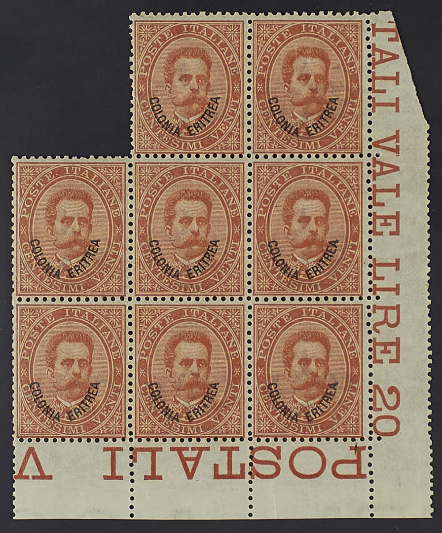 1893 - 20 c. arancio blocco di otto esemplari - Cert. Cardillo