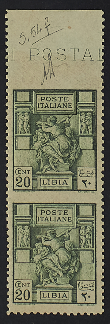 SIBILLA LIBICA 20 C. COPPIA VERTICALE BORDO DI FOGLIO SUPERIORE NON DENTELLATA AL CENTRO E IN ALTO