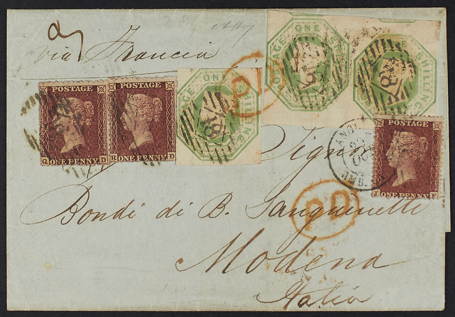 1847 - Effigie in rilievo 1 s. verde pallido esemplare singolo e coppia orizzontale + 1 p. rosso dent. 14 tre esemplari su lettera del 19 ottobre 1855 da Londra per Modena - Da esaminare - Cert. Bolaffi