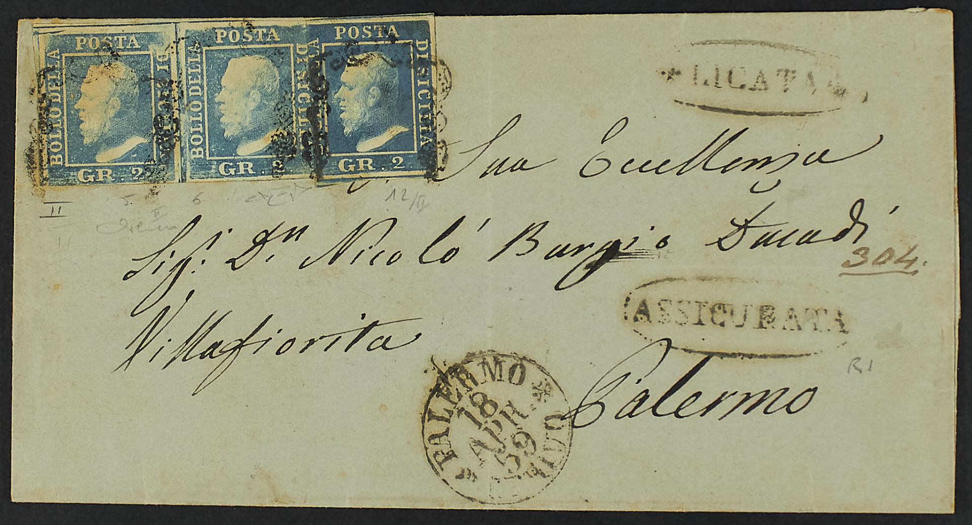 1859 - 2 gr. II tavola azzurro coppia orizzontale + 2 gr. II tavola cobalto su assicurata del 18 aprile da Licata, ovale sulla soprascritta, per Palermo - Cert. Cardillo - Firma Raybaudi