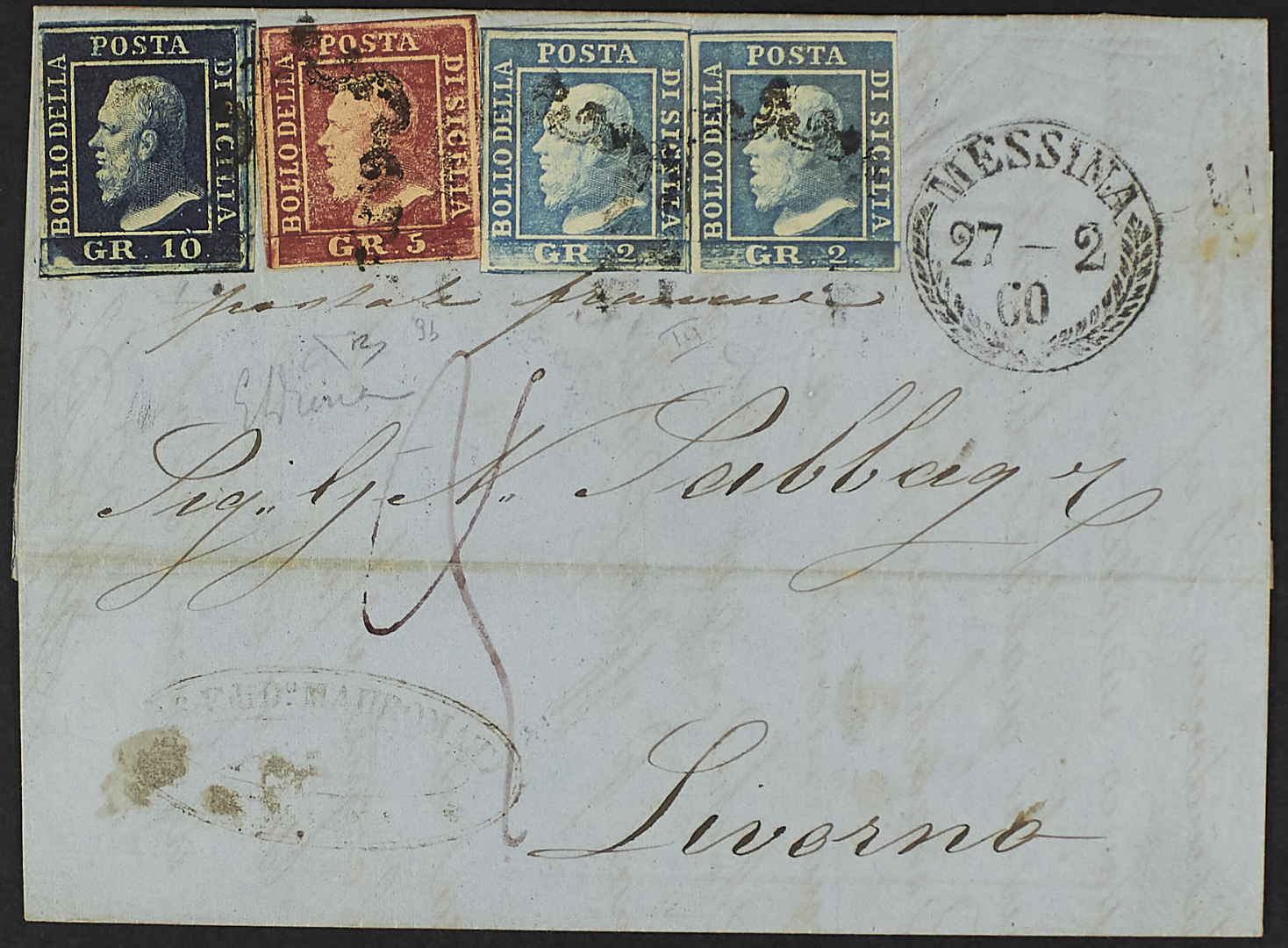 1859 - 2 gr. III tavola azzurro chiaro due esemplari + 5 gr. I tavola carminio scuro + 10 gr. azzurro cupo in affrancatura "tricolore" su lettera del 27 febbraio 1860 da Messina per Livorno - Molto bella - Cert. Diena