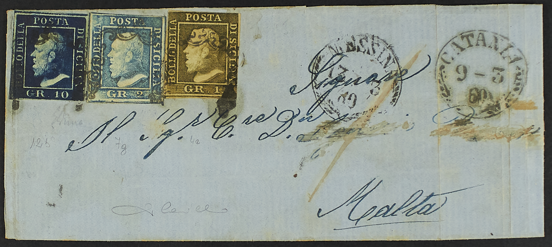 1859 - 1 gr. II tavola oliva grigiastro + 2 gr. II tavola azzurro chiaro carta di Palermo + 10 gr. indaco in affrancatura "tricolore" su lettera del 9 marzo 1860 da Catania per Malta via Messina - Da esaminare - Firme Cardillo e E. Diena