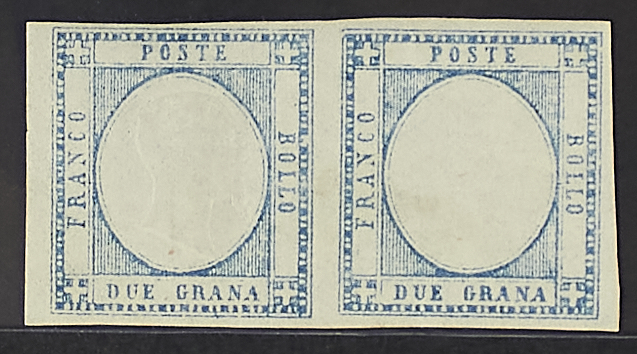1861 - 2 gr. azzurro chiaro coppia orizzontale con esemplare senza effigie - Cert. Diena