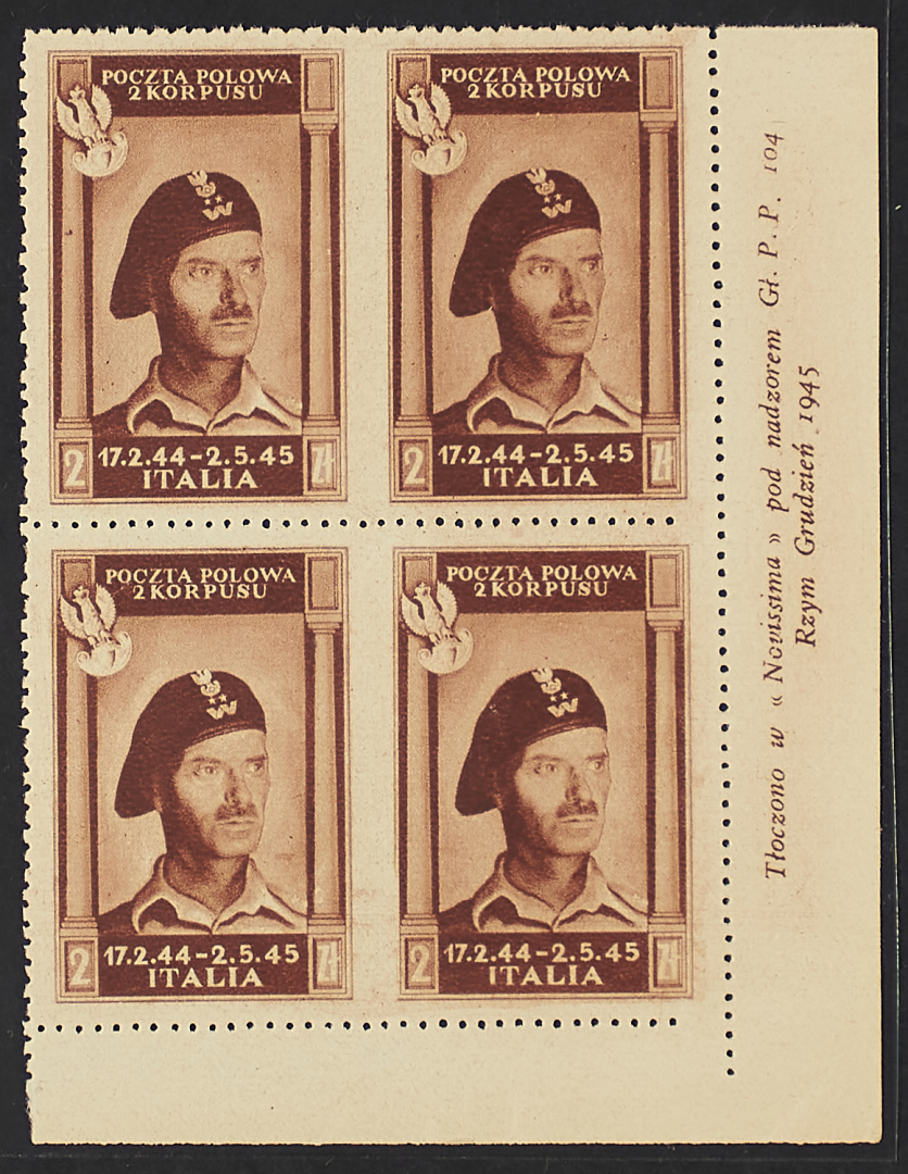1946 - Vittorie polacche - Carta bianca - 2 z. blocco di quattro angolo di foglio inferiore destro comprendente due coppie orizzontali non dentellate al centro