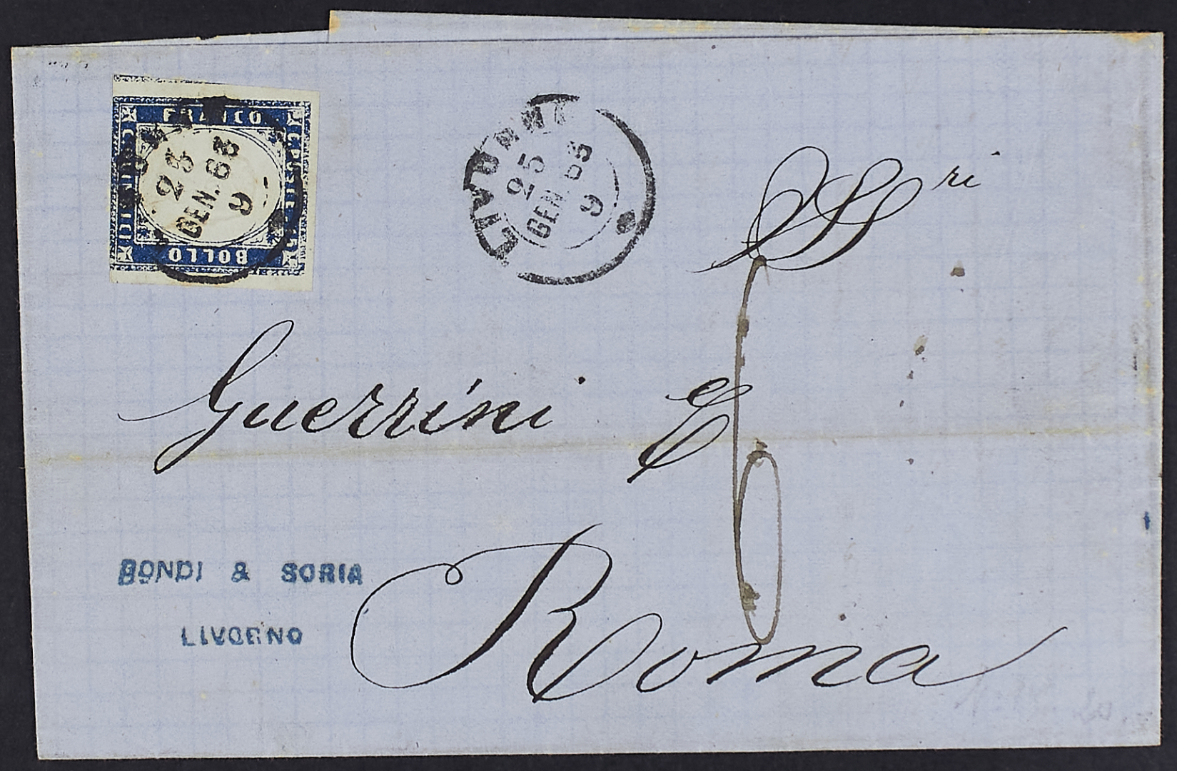 1863 - Tipo Sardegna 15 c. azzurro su lettera del 25 gennaio (primo mese d'uso) da Livorno per Roma - Tariffe tollerate per il Pontificio nel mese di gennaio 1863 - Da esaminare