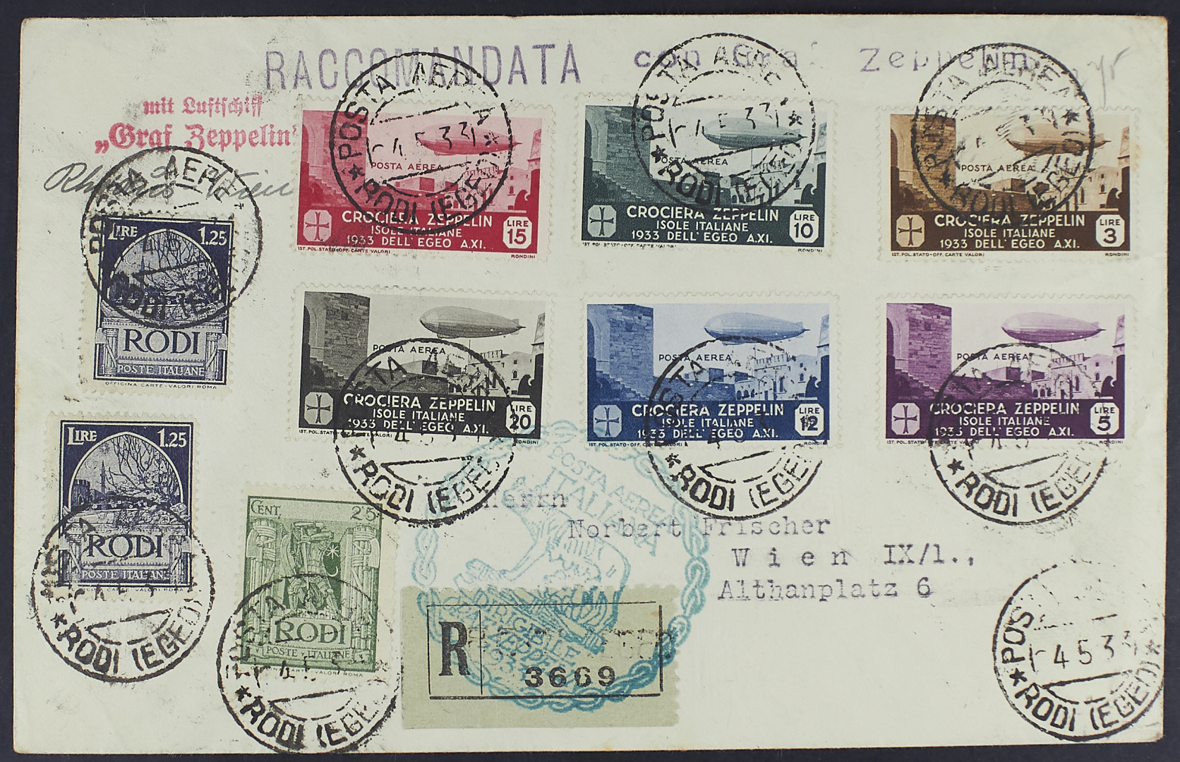 1933 - Zeppelin - La serie con valori complementari su raccomandata aerea del 24 maggio da Rodi per Vienna