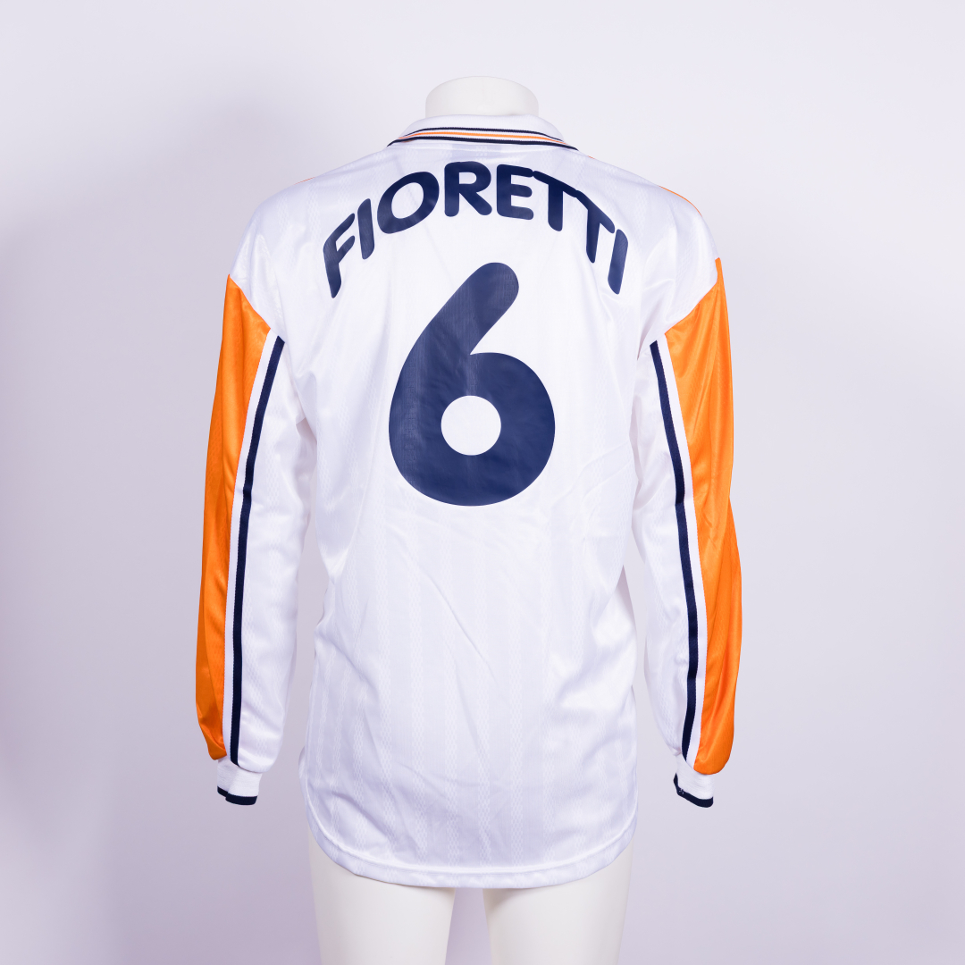 Sul fronte; sponsor commerciale Vannucci piante applicato, sponsor tecnico tridimensionale floccato e stemma del club cucito. In basso etichetta pro-match cucita.