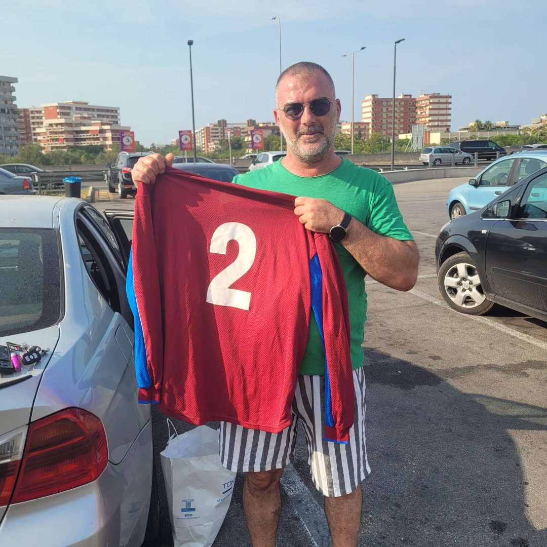 Sul fronte: sponsor commerciale Gastronomia Righi in vernicetta, sponsor tecnico e stemma del club tridimensionali floccati.