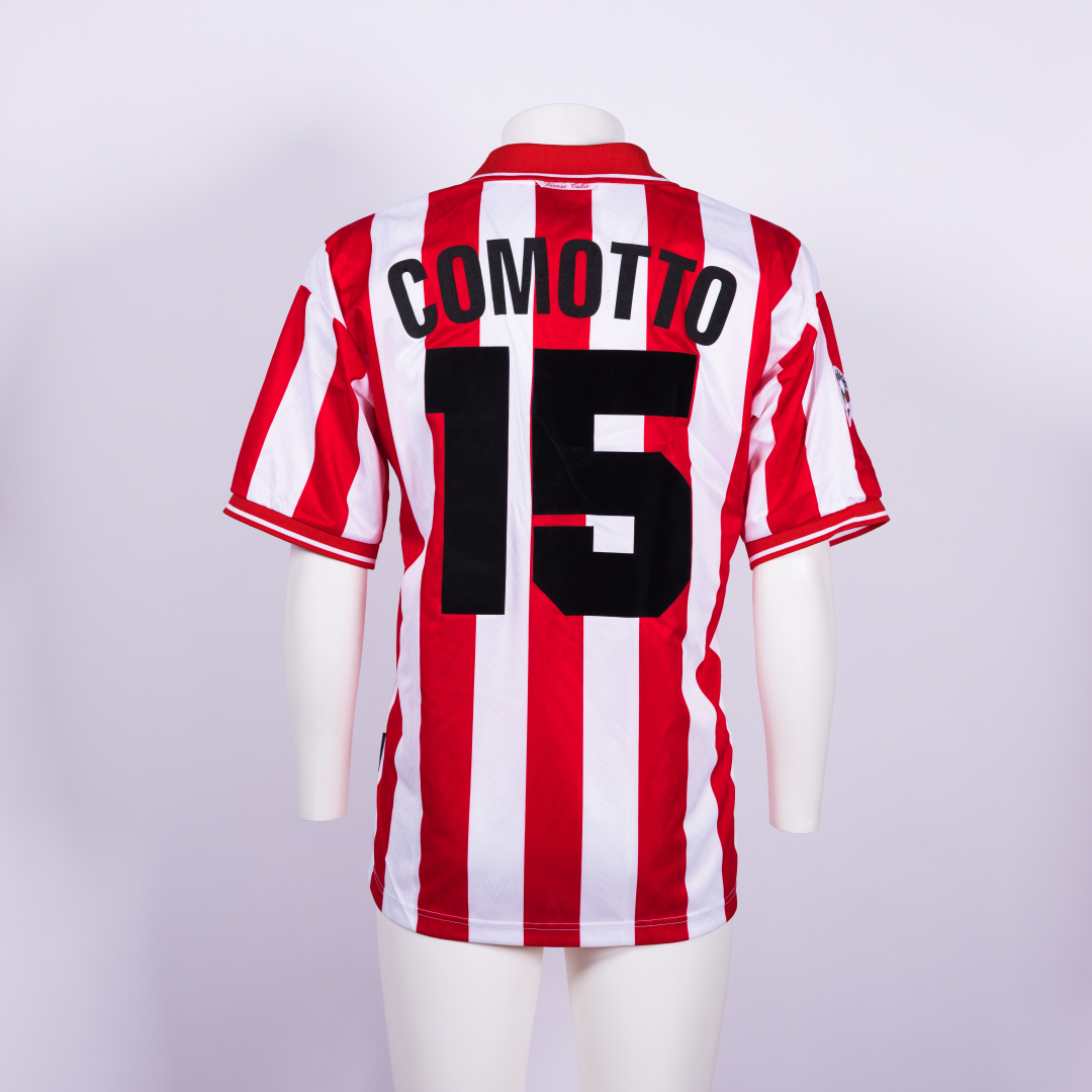 Sul fronte: sponsor commerciale Caffè Vero in sublimatico, sponsor tecnico ricamato, stemma del club cucito e firma autografa “Comotto”.