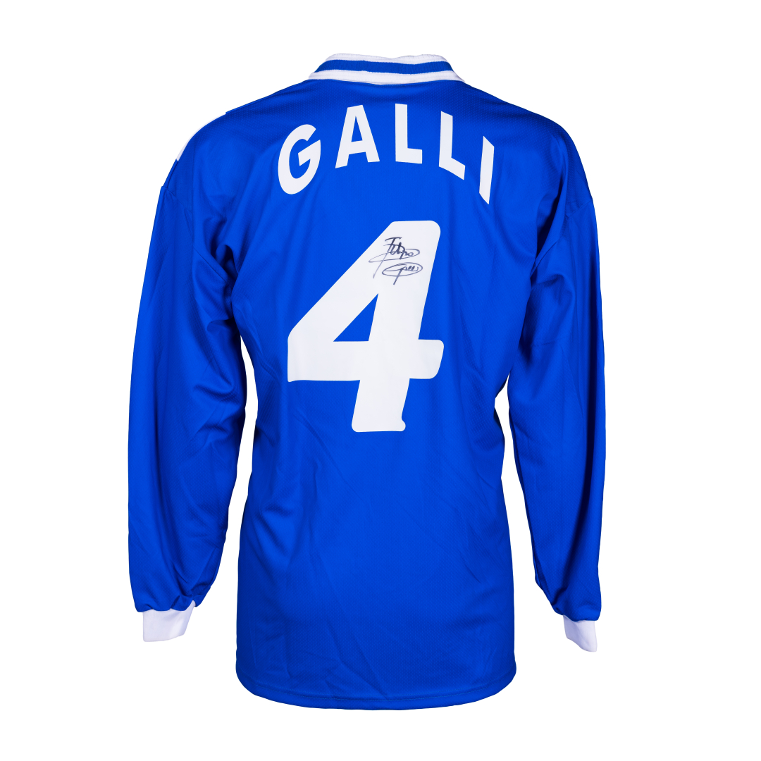 Sul retro: nome e numero 4 applicati. Sul numero firma autografa “Filippo Galli”.