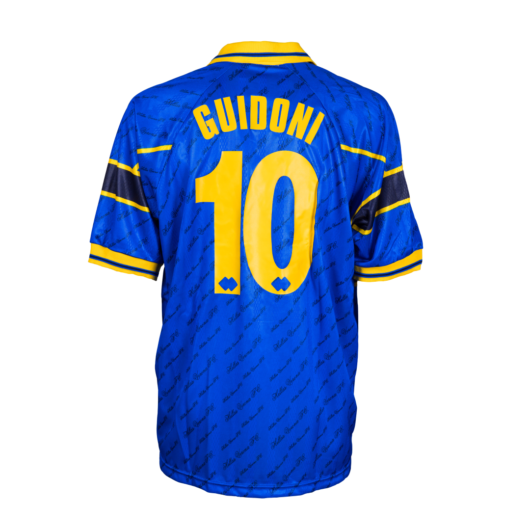 Sul fronte: sponsor commerciale Atreyu e sponsor tecnico in sublimatico, stemma del club tridimensionale applicato. Dedica e firma autografa “a Marcello con amicizia Stefano Guidoni”.