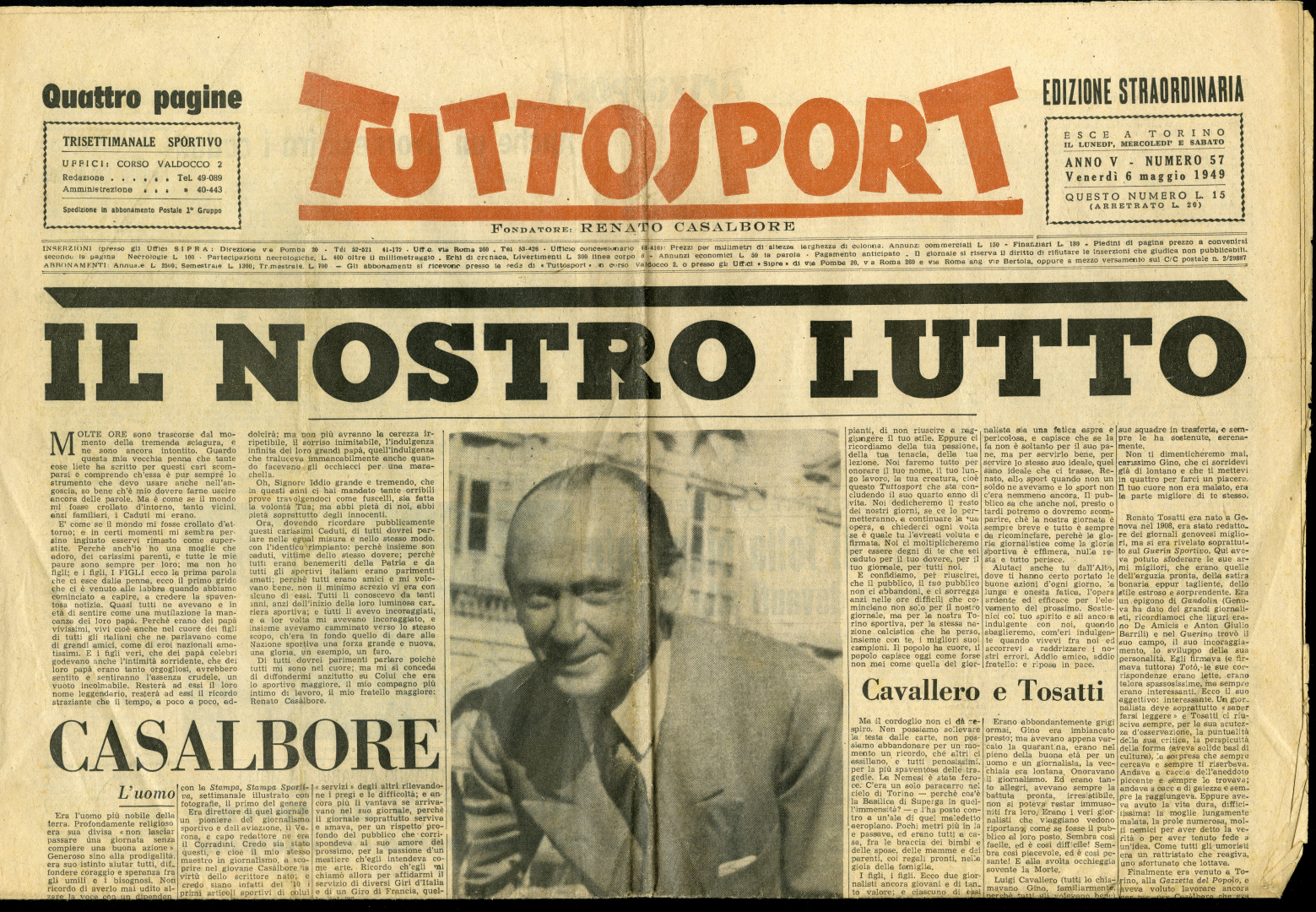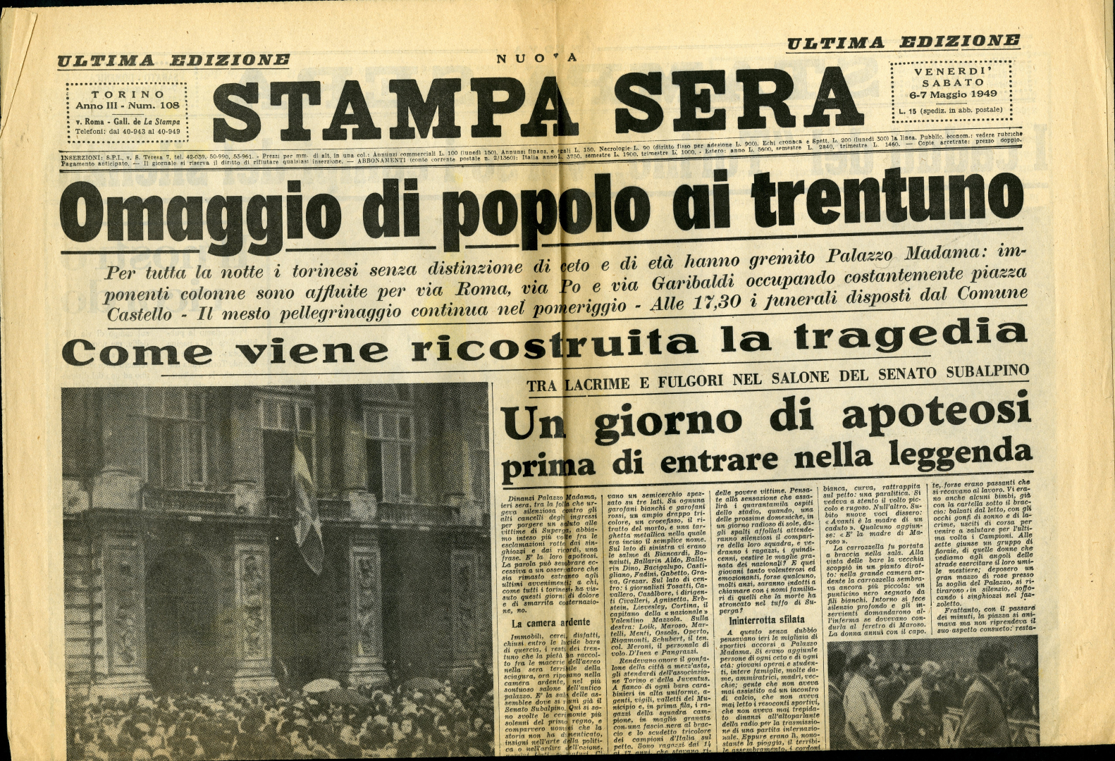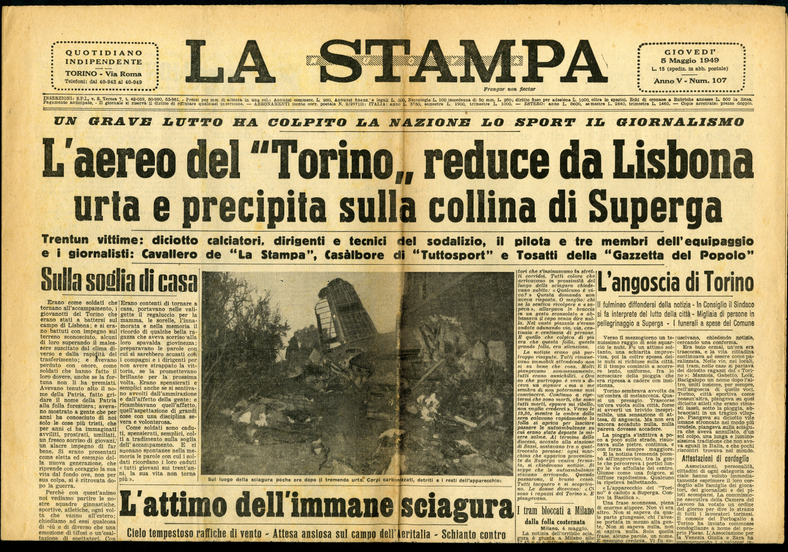 Gruppo di 3 quotidiani usciti dopo il tragico incidente aereo di Superga, composto da La Stampa del 5 maggio, Tuttosport del 6 maggio e Stampa Sera del 6-7 maggio. Unita anche una fotografia, in bianco e nero della squadra (8,5 x 13,5 cm).