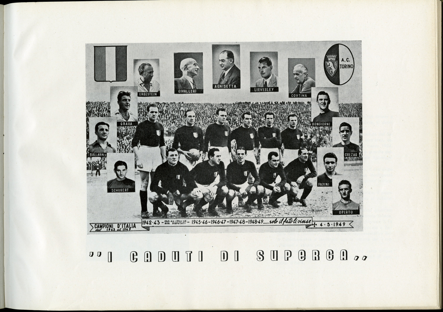 Splendido libro, con titolo e immagine di un calciatore impressi in oro al piatto anteriore. Contiene dettagliati capitoli sul Torino e la tragedia di Superga, la F.I.G.C., le società Italiane di serie A e B e tante altre informazioni, corredate di belle fotografie e stampe, anche a colori. Molto ben conservato.