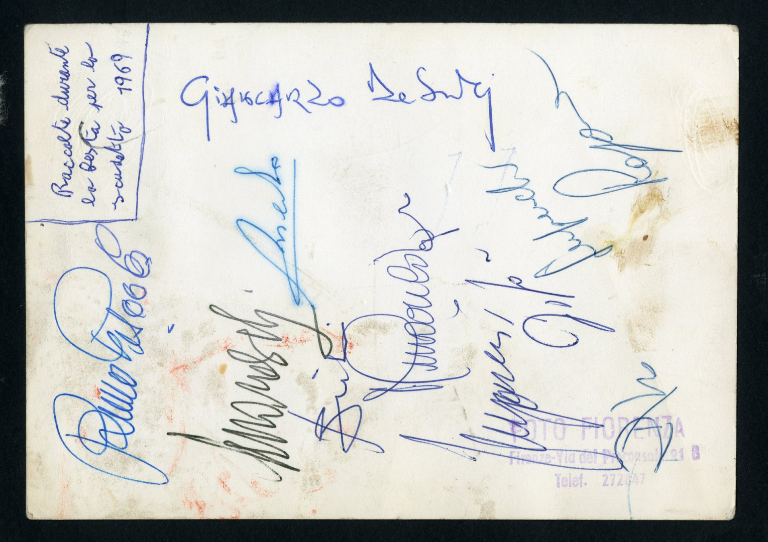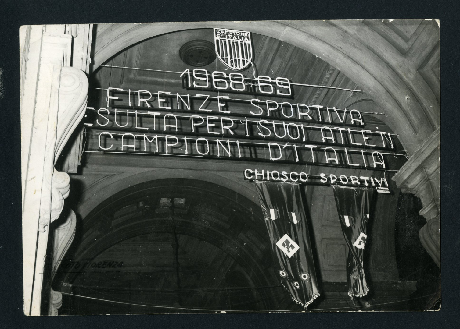 Cartolina fotografica raffigurante il Chiosco Sportivo per i festeggiamenti del secondo scudetto con le firme autografe della squadra.