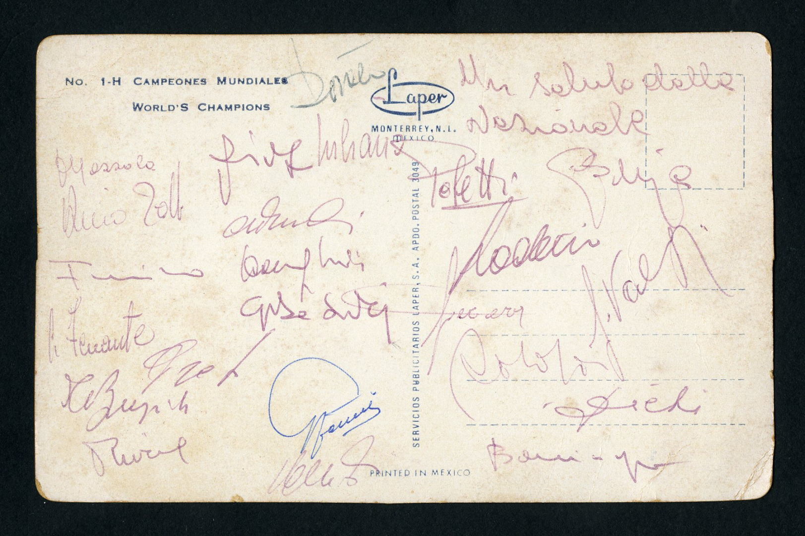 Cartolina ufficiale di Mexico 70 con al verso le firme autografe della Nazionale di Calcio italiana.
