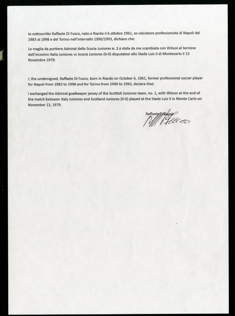 Maglia indossata in occasione dell’incontro Italia Juniores vs Scozia Juniores (0-0) del 13 novembre 1979 disputatosi allo Stade de Louis II di Montecarlo e scambiata con l’avversario Raffaele Di Fusco.