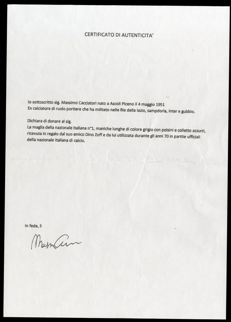 Maglia indossata da Zoff nel 1974 e donata all’amico e portiere Massimo Cacciatori in attività da