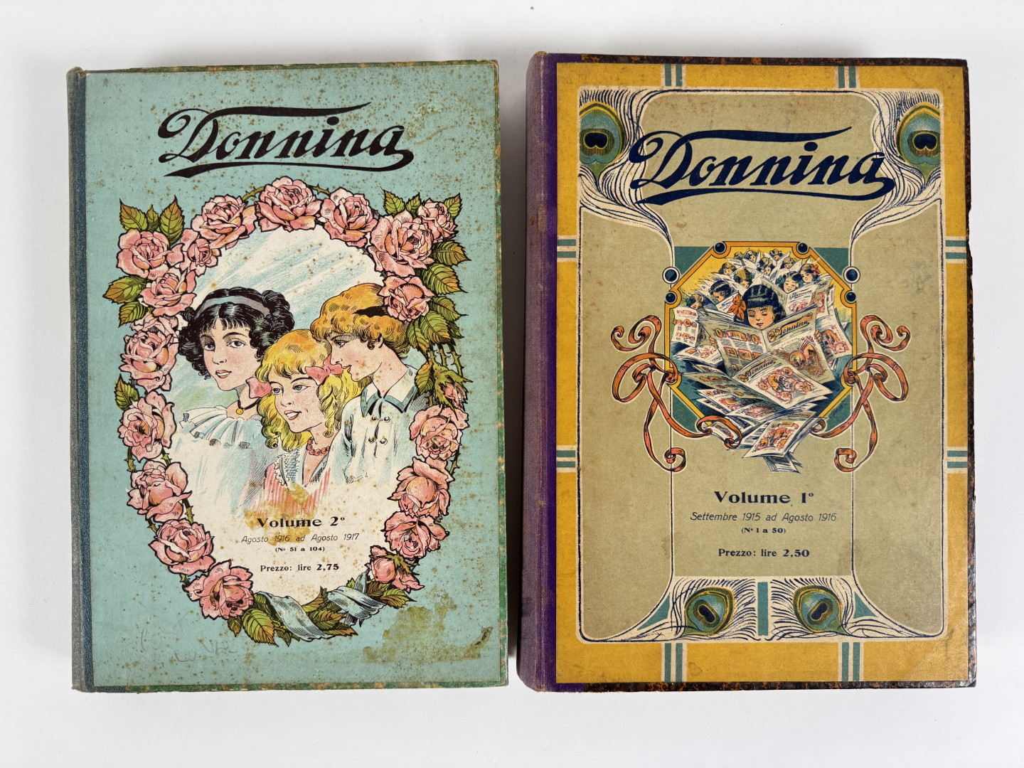Lotto composto da due volumi rilegati contenenti i primi 104 fascicoli di Donnina. In buone condizioni.