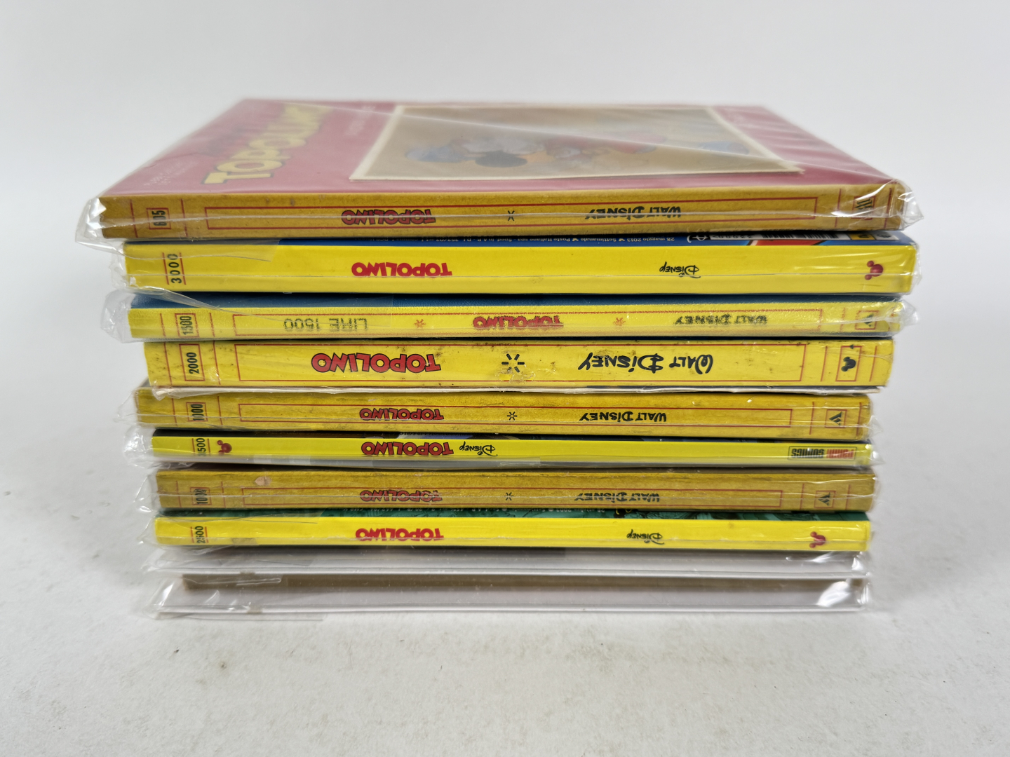 Lotto composto da dieci albi di Topolino Libretto, NN. 605 (senza gadget), 577, 500, 1000 2x, 1500, 2000 blisterato, 2500, 3000, 3500. In eccellenti condizioni.