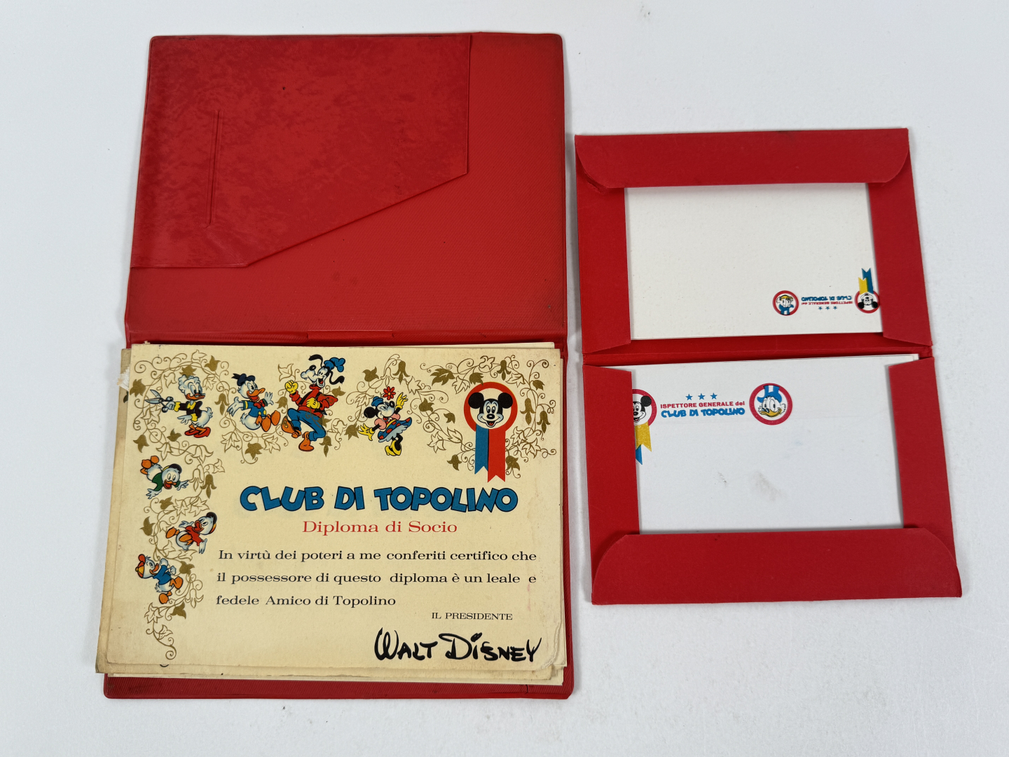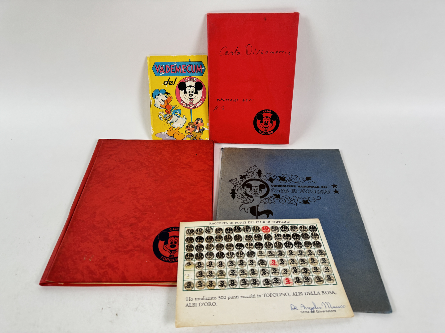 Lotto composto da cartolina punti, Vademecum del Club, contenitore carta diplomatica, raccoglitore con diplomi, folder consigliere nazionale del club. Buone condizioni.