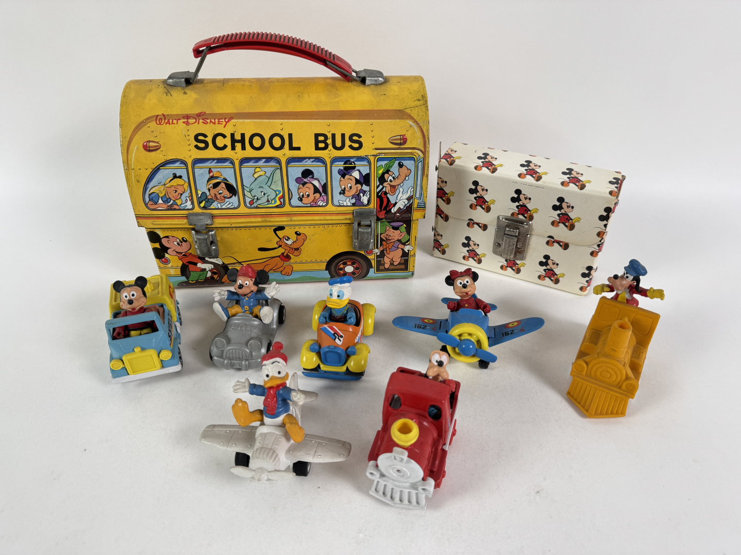 Lotto composto da: Schoolbus in latta anni '70, pochette per l'asilo in cartone, e 7 modellini in metallo scala 1:43. In buone condizioni.