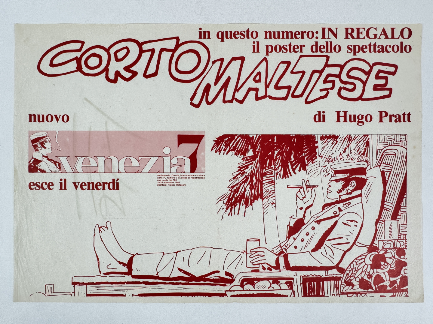 Lotto composto da due inserti: 1. Supplemento al n. 6 di Corto Maltese in buone condizioni, piegato, cm 61x46. 2. Inserto a Venezia7 del 1982. Piegato, in buone condizioni.