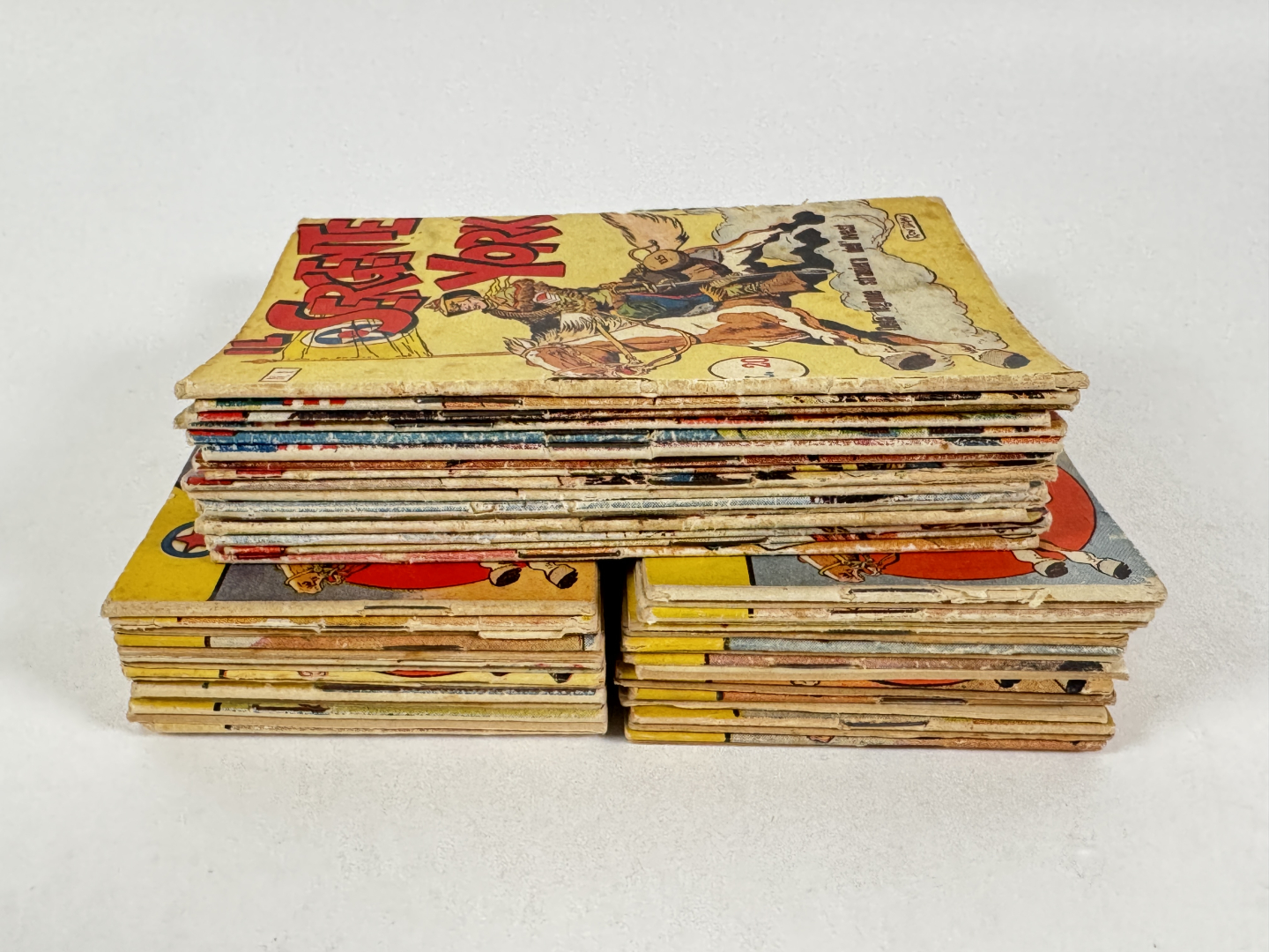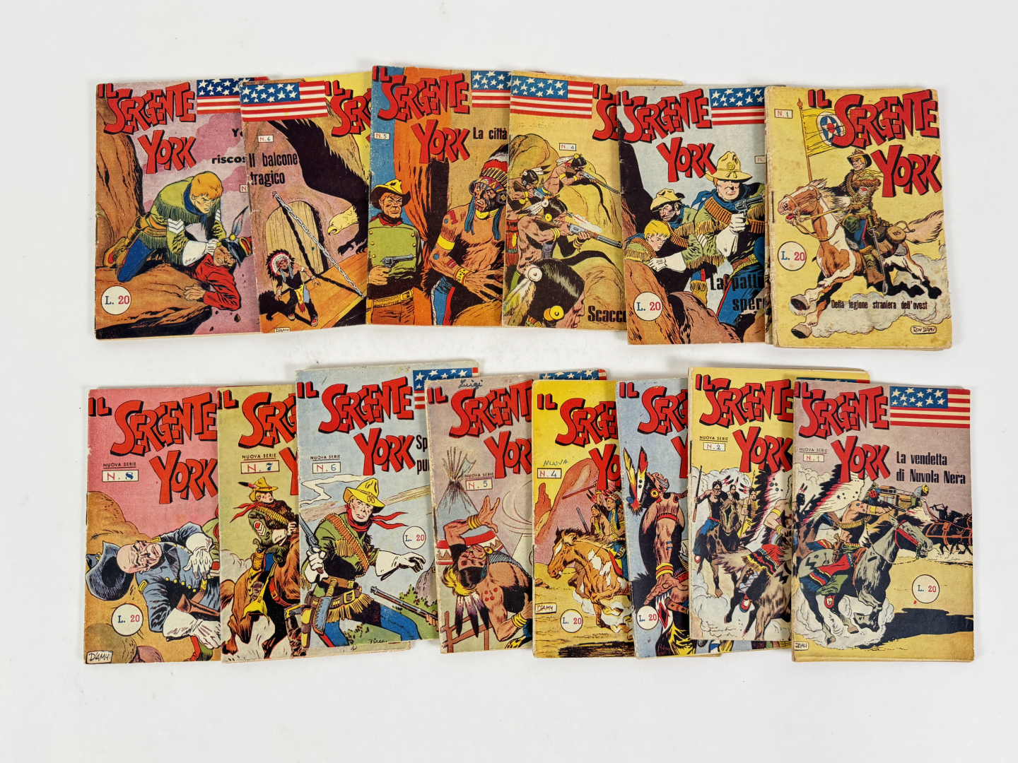 Lotto composto dalle quattro serie del Sergente York. Serie I NN. 1/8, Serie II NN. 1/8, Serie III NN. 1/18, Serie IV NN. 1/15. In condizioni molto buone, N. 1 della serie III in discrete condizioni, alcuni albi con piccole macchie in copertina.