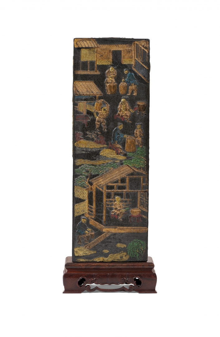 Piastra di fuliggine di resina vegetale e colla, prodotta a stampo, dipinta e parzialmente dorata, decorata con scene di vita quotidiana, sui fianchi una fenice e un drago, in alto e in basso motivi di pushou.