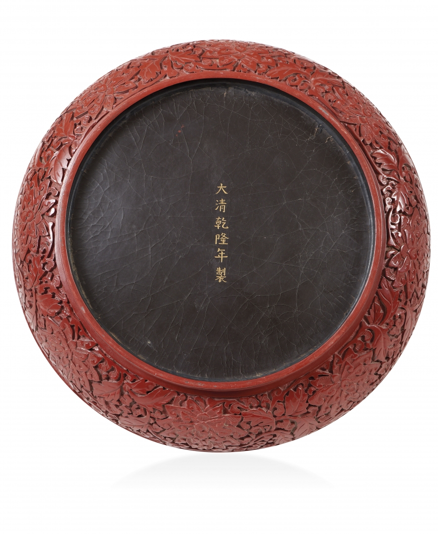 In lacca rosso cinabro, con interno e base laccati in nero. Una fascia a peonie circonda il medaglione centrale con scena letteraria che si svolge attorno ad un palazzo in riva ad un fiume. Iscrizione dipinta in oro sotto la base大清乾隆年製 da Qing Qianlong nianzhi ("prodotto durante il periodo Qianlong della grande dinastia Qing").