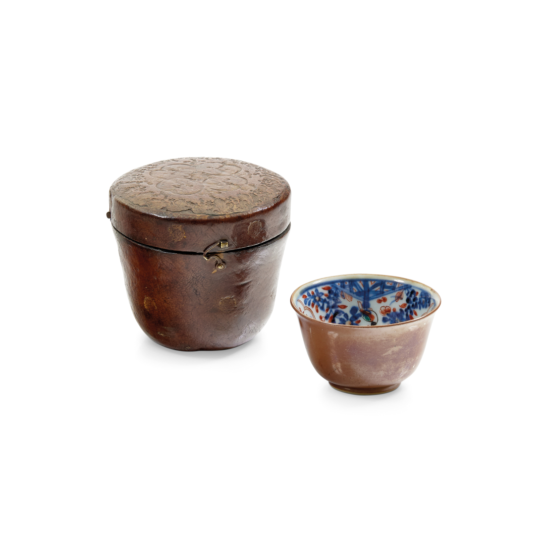 Tazzina in porcellana con esterno ‘café au lait’ e interno con decoro floreale a smalti della famiglia 'Imari', entro bella e rara custodia di manifattura europea in cuoio con decoro floreale impresso e interno in velluto.