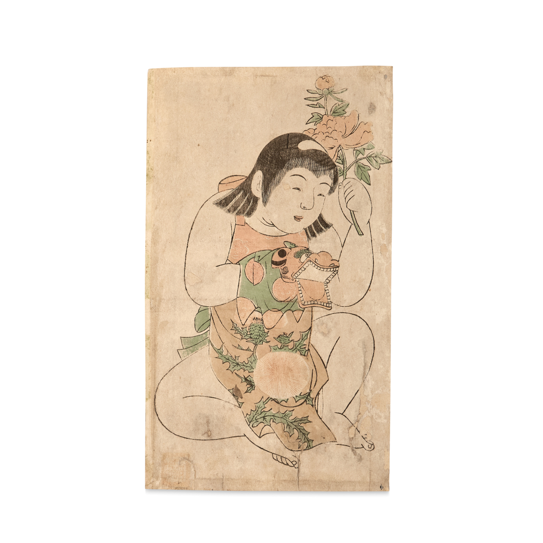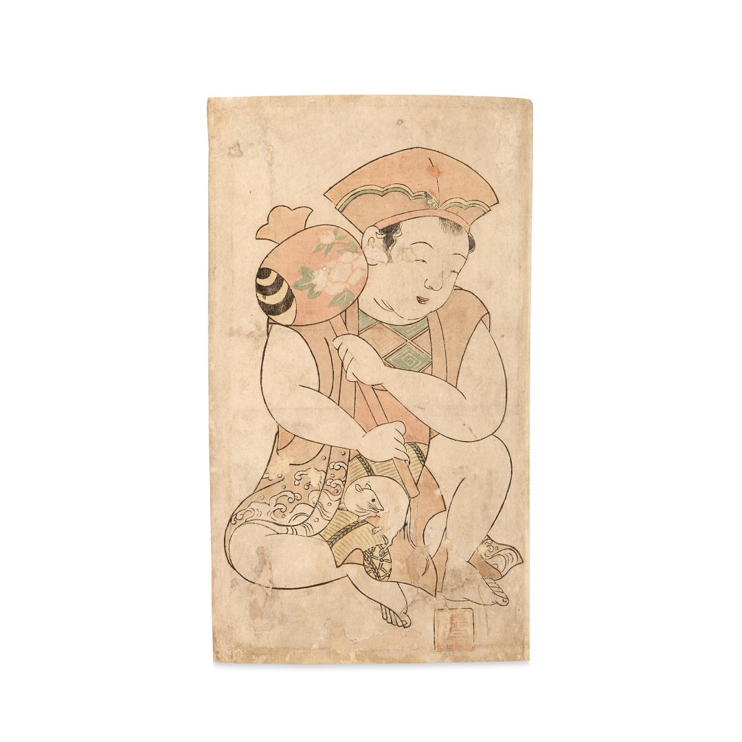 Ognuna raffigurante un bambino con attributi che rimandano all’iconografia di divinità popolari, nello stile di Kitao Shigemasa (1739-1820).
