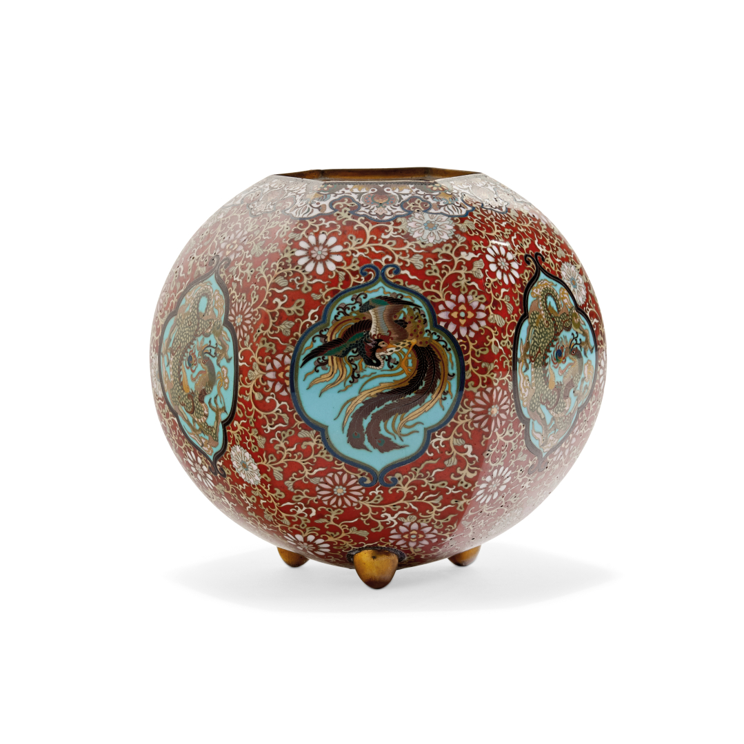 Metallo smaltato a cloisonné, sezione esagonale, l’esterno con un esuberante decoro policromo di draghi e fenici entro cartigli polilobati a riserva su fondo di tralci floreali.